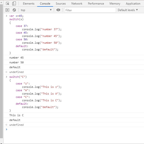 case문은 위와 같이 생겼다. 첫 번째 예시코드를 보면 switch의 표현식에는 x가 들어가 있다. x=45이므로 45의 값과 일치하는 case문을 실행한다. 따라서 “number 45”가 출력된다. 근데 잘 보면 희한하게 “number 50”과 “default”라는 문자열도 출력된 것을 알 수 있다. 두 번째 예시에서도 “This is C”뿐만 아니라 “default”라는 문자열이 같이 출력됐다. 왜 그럴까?