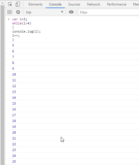 while문의 구조는 위와 같이 매우 단순하다. 조건문의 평가 결과가 참이면 코드 블록을 계속 실행하고, 거짓이면 코드블록을 실행하지 않고 종료한다. 만약에 조건식의 평가 결과가 불리언 값이 아니면 불리언 값으로 형변환하여 참, 거짓을 구별한다.