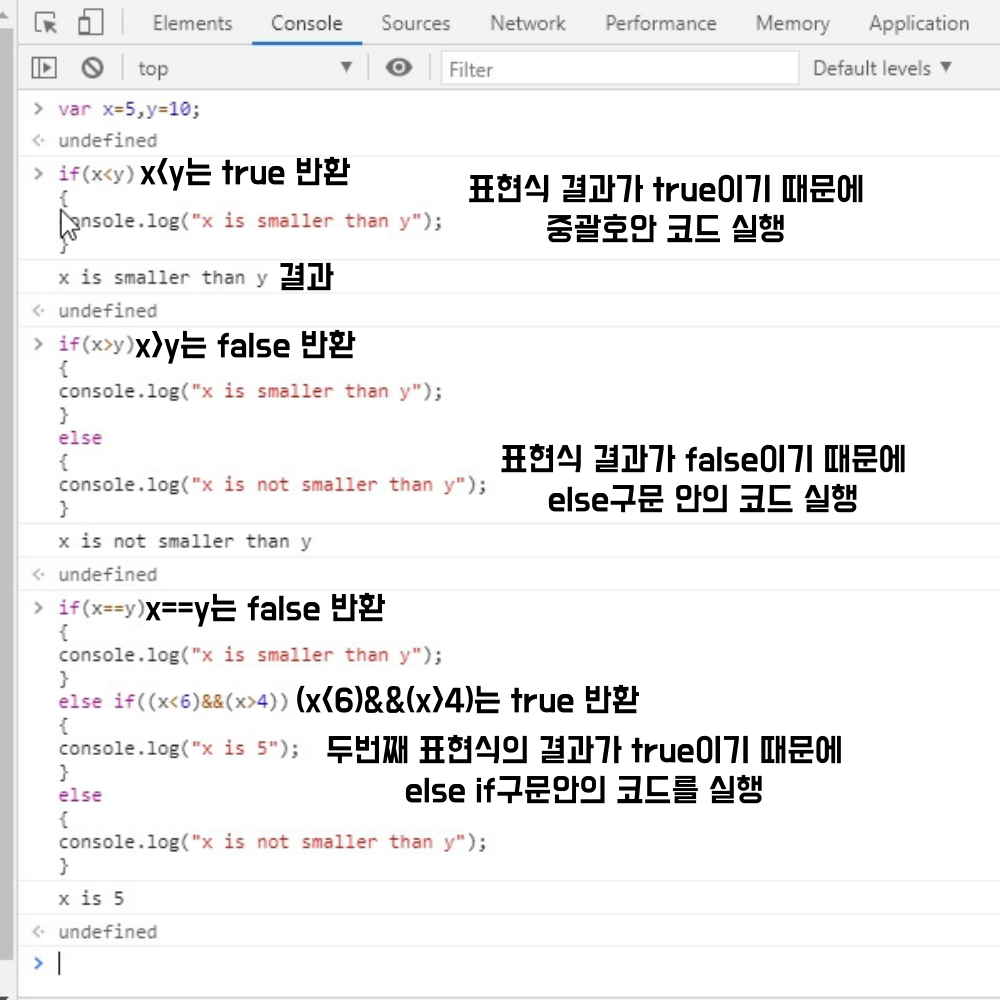 - 세 번째 예시에선 if, else if, else를 사용하였다. else if는 else와 동일하게 조건식을 검사한 후, true일 경우 해당 블록을 실행한다. else if는 여러 번 사용할 수 있지만, if와 else는 한 번 밖에 사용하지 못함에 유의한다. else문은 if와 else if의 조건식이 모두 false일 때 실행된다.